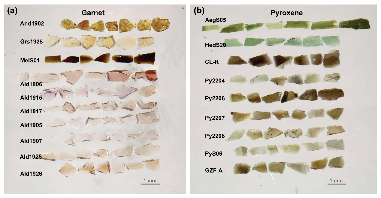 图1 筛选的天然石榴石(a)和辉石(b)标样