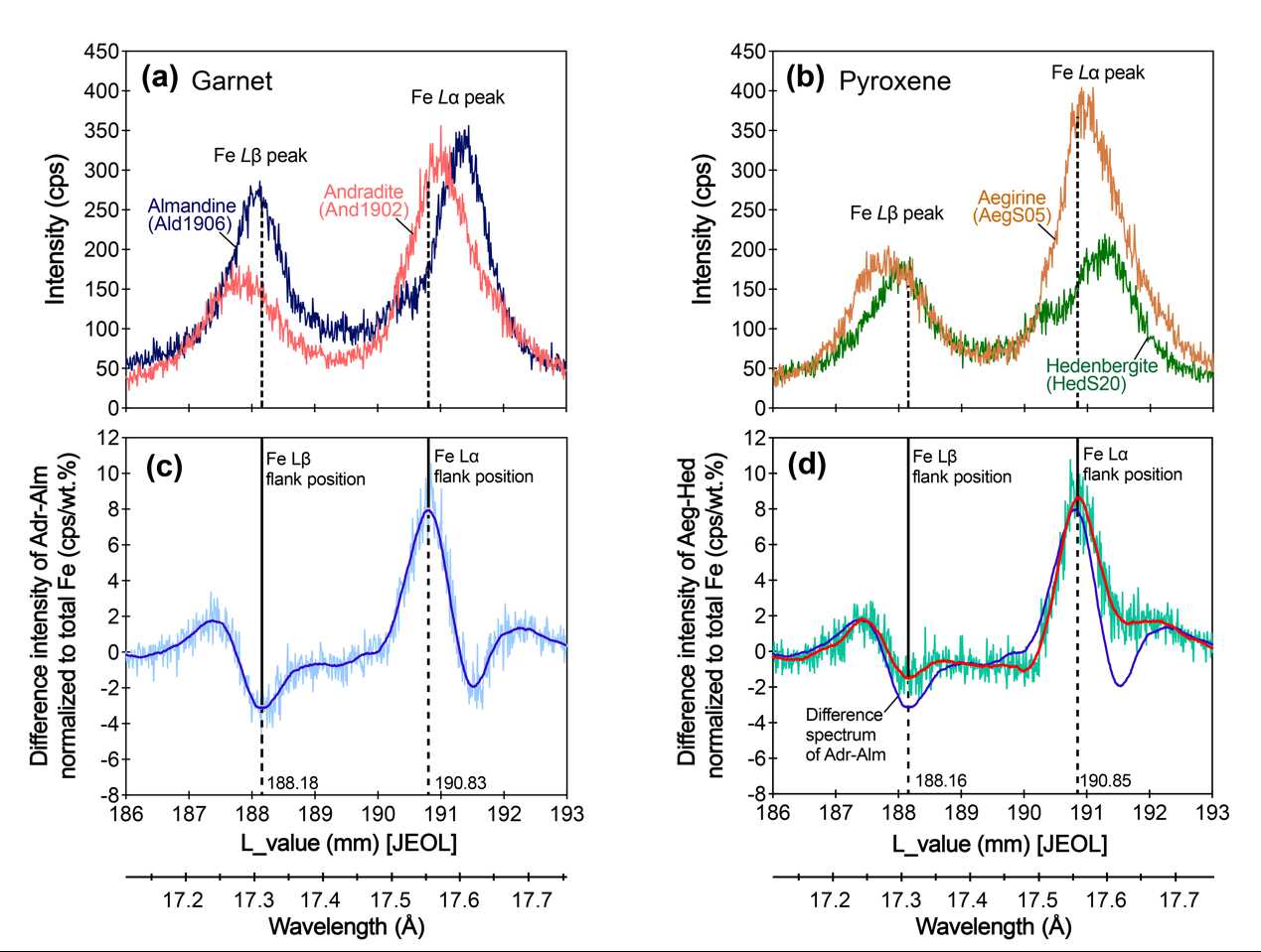 图2 石榴石和辉石端元矿物Fe的L能级X射线谱线(a-b)及两者的差值谱线(c-d)