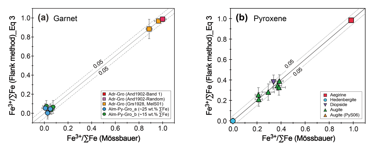 石榴石和辉石是地幔和地壳中的常见矿物,其Fe³⁺/ΣFe比值能够提供有关地幔熔融、岩浆演化及地壳-地幔相互作用的关键信息。为此,中国科学院广州地球化学研究所曹永华工程师、邢长明副研究员、王焰研究员及其合作者,基于电子探针“峰肩法”的分析原理,从大量天然石榴石和单斜辉石样品中筛选出了10个天然石榴石和9个天然辉石两套校正标样(图1),并在JEOL JXA-8230型电子探针上成功建立了石榴石和辉石主量元素含量和Fe3+/ΣFe比值同步分析的方法。取得的主要进展包括:1)利用电子探针和穆斯堡尔谱标定了筛选出的石榴石和辉石主量元素含量和Fe3+/ΣFe比值,验证了这些标样可用于测定L能级谱线峰位的峰侧位置(图2);2)基于标定的校正标样,采用多重线性回归方程计算了石榴石和辉石的Fe3+/ΣFe比值,计算结果与参考值的误差分别小于0.05和0.06(图3);3)提出采用谱仪初始化操作替代前人提出的谱仪校正流程,将谱仪校正时间从40分钟缩短至约5分钟,提高了测试效率。这些标样的开发为后续开展相关应用研究提供了重要的技术支持。