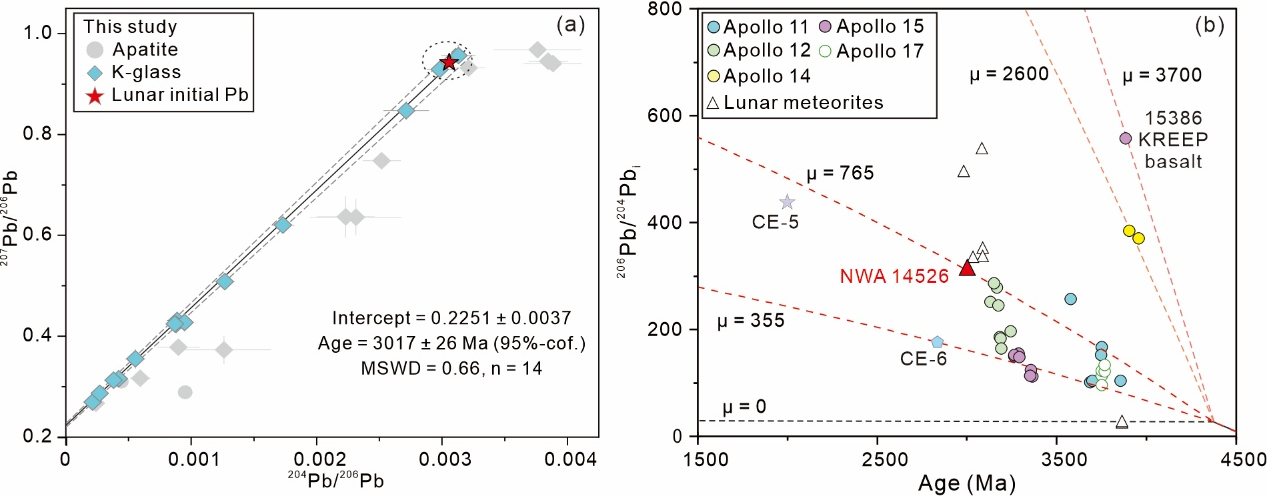 图2 SIMS Pb-Pb同位素结果。(a) Pb-Pb等时线;(b) 月海玄武岩Pb同位素初始比随年龄变化。虚线为计算的源区μ (238U/204Pb)值。NWA 14526的μ值略高于嫦娥五号月海玄武岩。