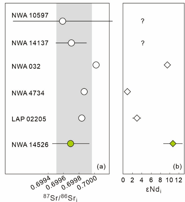 图4 30亿年月球玄武质陨石Sr-Nd同位素组成。尽管NWA 14526与其他陨石具有相似的Sr同位素组成,但其显著高的Nd同位素比值表明NWA 14526与其他30亿年月球玄武质陨石具有不同的源区。