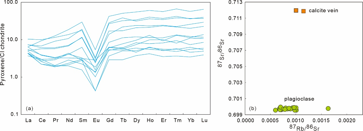 图6 NWA 14526辉石稀土配分图 (a)和斜长石、方解石脉Rb-Sr同位素组成 (b)。受方解石脉影响,部分辉石数据显示轻稀土富集的特征。