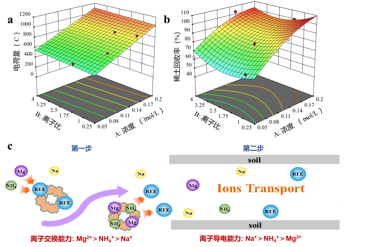结果表明,提取剂浓度对总电荷量呈线性作用,阳离子种类及其配比对总电荷量的影响较小(图1a);提取剂浓度、阳离子种类及其配比与电荷量呈二次关系式(图1b),复合提取剂对稀土回收表现出显著的协同效应,其机理主要是离子交换能力和土壤导电性的共同增强(图1c)。