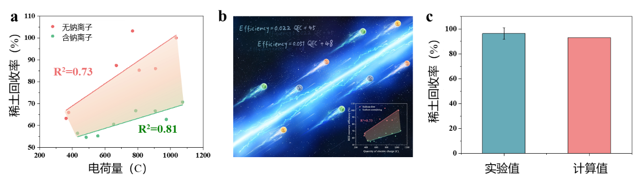 图2.(a)稀土回收率和总电荷量的拟合图,(b)电荷量和稀土回收率之间的量化关系,(c)基于单一提取剂加权后稀土元素回收率实验值与计算值的比较