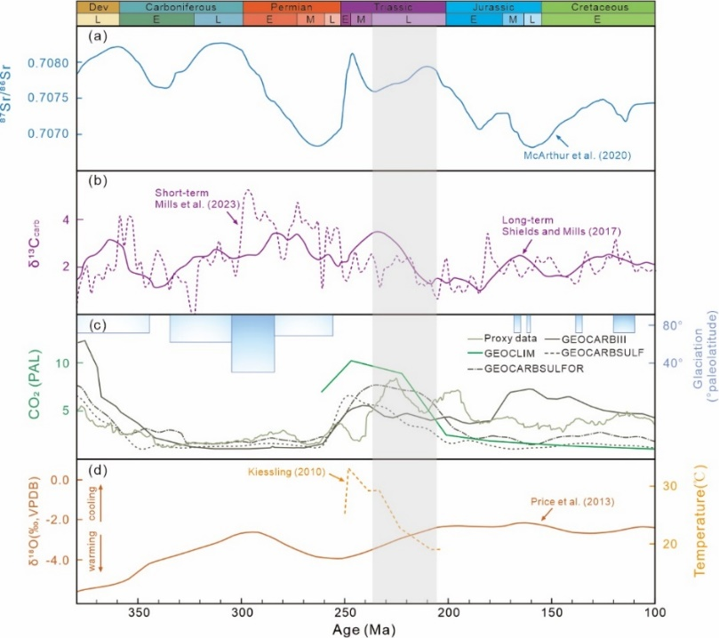 图2、晚三叠世海洋锶同位素、碳同位素与古气候指标演化特征。(a)该时期海水⁸⁷Sr/⁸⁶Sr值的显著升高,指示大陆硅酸盐风化作用持续增强;(b)碳酸盐岩δ¹³C值的降低,反映碳酸盐埋藏相对增加而有机碳埋藏相对减少;(c-d)晚三叠世大气CO₂浓度与基于氧同位素估算的全球温度呈现总体下降趋势。