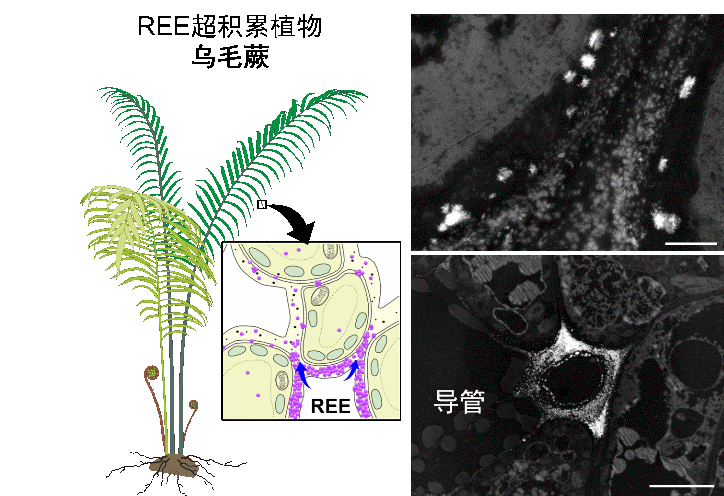 尽管人们已知微生物和动物能在生物体内“造矿”,例如趋磁细菌合成的纳米磁铁矿,贝壳及珊瑚沉积形成的方解石和文石,动物牙齿和骨骼中矿化的磷灰石等。但植物界的“矿物制造能力”在此前一直被低估。已知的植物矿物仅有少数几种,如方解石和草酸钙石等钙质晶体以及植硅体。本研究首次在乌毛蕨中发现稀土纳米矿物结晶矿化现象,不仅刷新了我们对植物矿物形成的认知,还为植物对重金属积累过程中的富集和解毒机制研究提供了新的方向,也为近千种已知超富集植物的研究开辟了新方向。