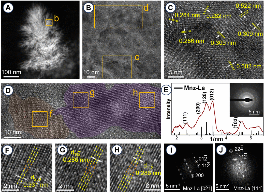 图2 稀土纳米颗粒的生物矿化特征;(A)稀土纳米颗粒HAADF-STEM图;(B-D)纳米颗粒内部高分辨图;(E)稀土纳米颗粒的选区电子衍射表征,Mnz-(La)为monazite-(La);(F-H)独居石纳米晶体定向附着高分辨图;(I-J)独居石纳米晶体FFT图