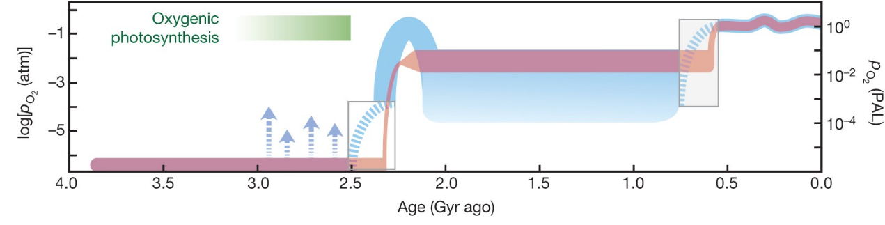 图 1. 地质历史时期地球大气氧气含量演化样式图,展示了从过去到现在大气氧气含量随时间的变化趋势,数据来源为 Lyons et al., Nature 2014。