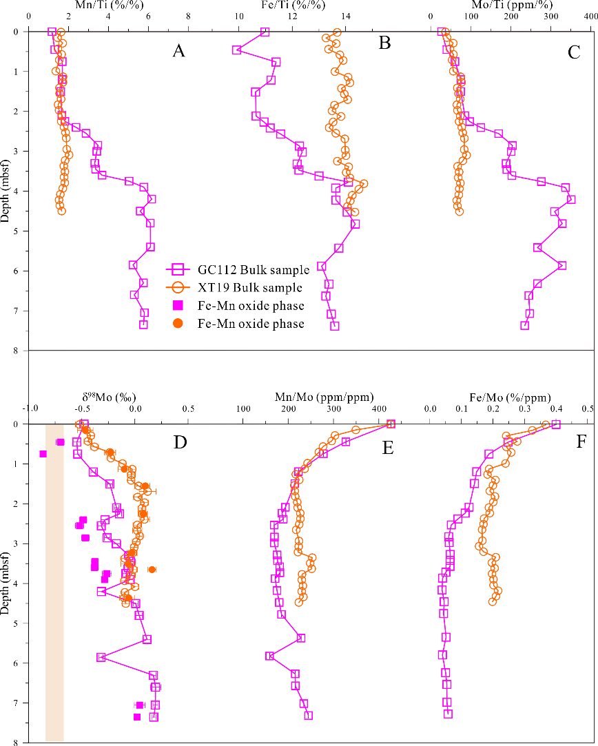 图3. 西太平洋深海沉积物中随深度变化的钼同位素与金属比值。该图展示全岩样品以下参数的深度剖面:(A)锰钛比(Mn/Ti)、(B)铁钛比(Fe/Ti)、(C)钼钛比(Mo/Ti)、(E)铁钼比(Fe/Mo)、(F)锰钼比(Mn/Mo);(D)同时呈现全岩沉积物(空心符号)与提取的铁锰(氢)氧化物相(实心符号)的钼同位素值(δ⁹⁸Mo)。“mbsf” 表示海底以下深度(单位:米)。作为参考,黄色条带代表水成铁锰结壳与结核的平均 δ⁹⁸Mo 值(-0.70±0.14‰)。