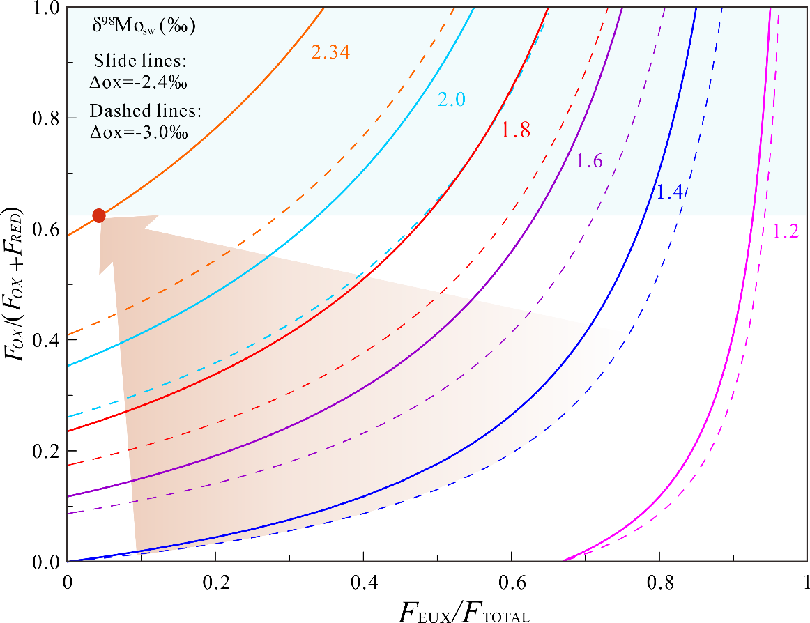 图 5. 海水δ⁹⁸Mo与海洋汇分布关系的模拟结果。该模型基于 euxinic 汇(FEUX)、还原态汇(FRED)及氧化态汇(FOX)的相对占比,展示了海水 δ⁹⁸Mo 的稳态值。红色圆点代表现代钼同位素收支平衡状态,浅蓝色阴影区域为不合理的质量平衡解。带箭头标注的阴影区域则呈现了随深海氧化程度增强,海水 δ⁹⁸Mo 值的预测变化趋势(据 Chen 等人,2015 年修改)。