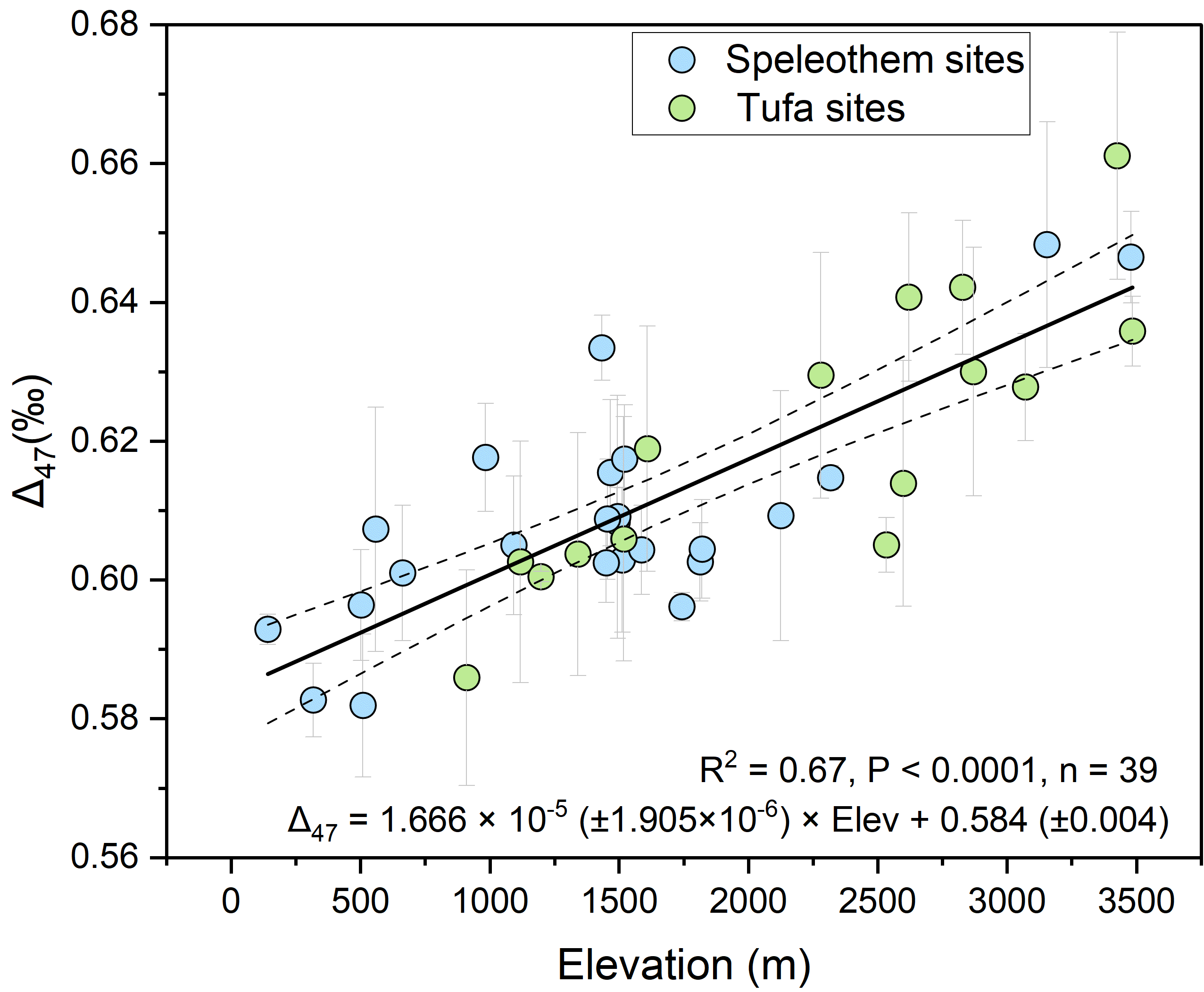 图2. 采样点平均的Δ47值与海拔的相关关系