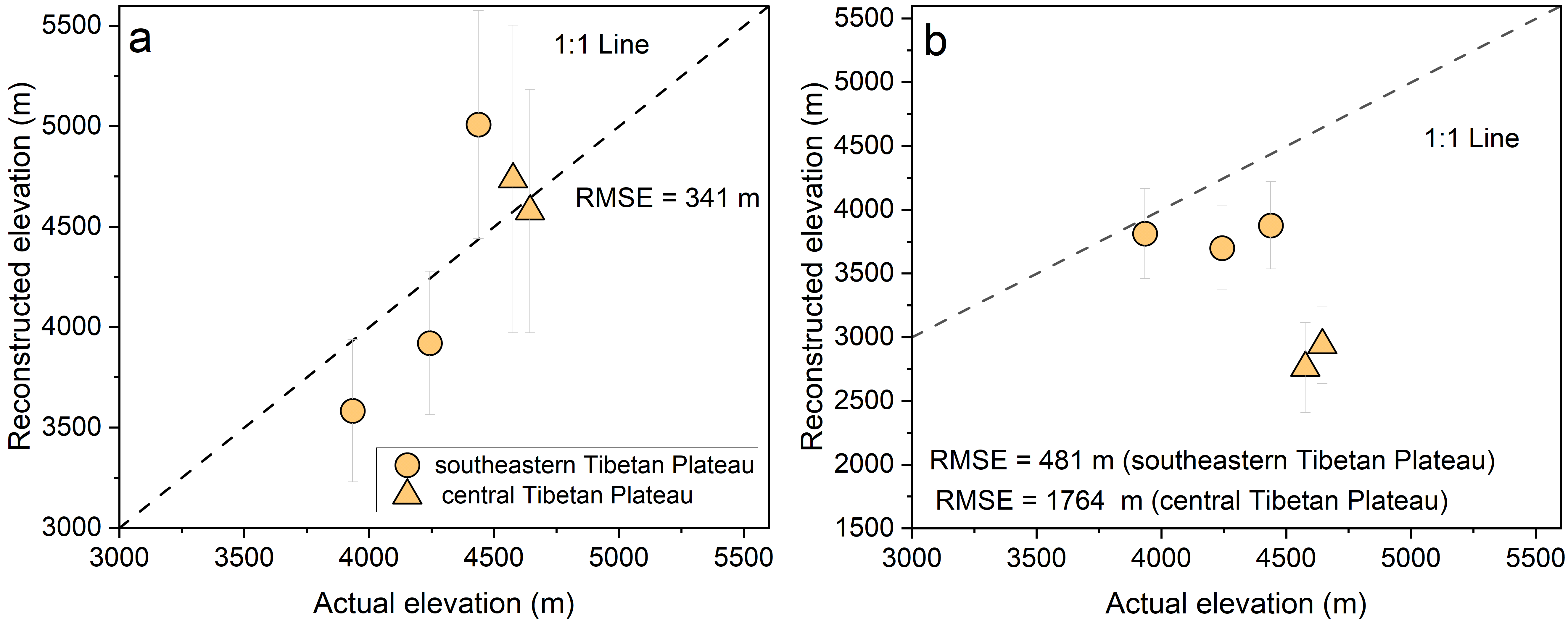 图4.(a)基于云南地区现代 Δ47–海拔关系(a)和δ18Ow–海拔关系(b)的高程重建与实际海拔对比