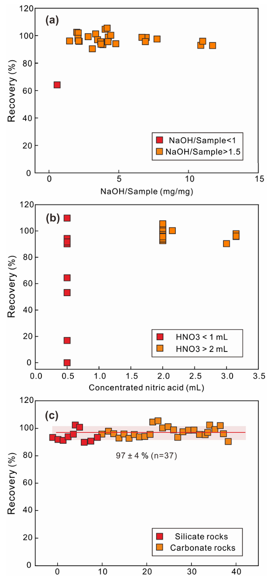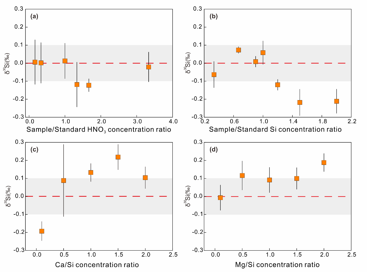 针对上述问题,中国科学院广州地球化学研究所博士研究生刘懋锐在韦刚健研究员的指导下,建立了碳酸盐岩硅同位素测试方法,实现了高精度δ29/28Si和δ30/28Si同位素比值测定,取得的主要进展包括:1)确定了NaOH碱熔剂以及提取高温熔融残余物的浓硝酸用量对样品消解过程的硅元素回收率的影响(图1);2)评估了阳离子交换树脂的承载能力,在保证与基体元素完全分离的前提下,降低了待测元素的稀释倍数(图2);3) 评估了酸度匹配、浓度匹配、基体效应对质谱测试的影响(图3);4)首次报道了七种碳酸盐岩标准物质的硅同位素组成数据(图4),为后续开展相关应用研究提供了参考。