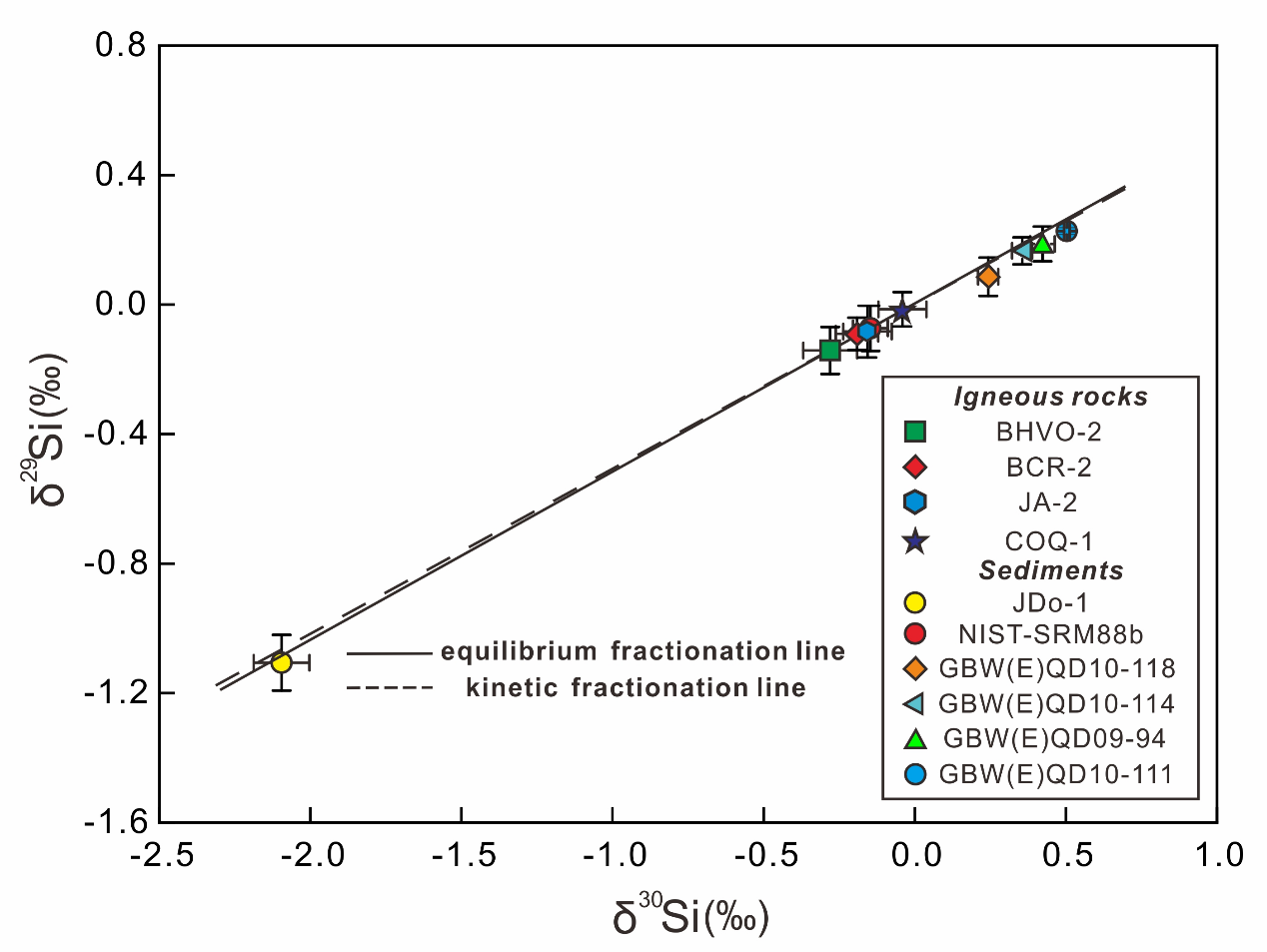 硅是地球中丰度第三的元素,其在地球不同地质储库中的分布与循环过程对揭示地球内部物质分异和地表环境演化机制具有重要意义。例如,全球硅循环被认为与碳循环存在紧密联系,地球表面的硅酸盐岩持续化学风化调节着长时间尺度的大气二氧化碳浓度,进而直接影响全球气候变化。然而,对于这一过程的调控机制的认知仍然不清楚。硅拥有三个稳定同位素(28Si, 29Si, 和30Si),是示踪硅地球化学循环的敏感指标,因而硅同位素组成或有助深入揭示硅循环与碳循环的联系。硅同位素研究最早可追溯至二十世纪五十年代,传统分析测试方法是将硅转化为SiF4,然后使用气源质谱进行同位素比值测定,流程相对复杂分析效率不高。二十一世纪初,多接收器电感耦合等离子体质谱仪(MC-ICP-MS)技术的兴起使得硅同位素测试的熔样方式和质谱测量均得到改进,该方法不仅普遍获得比气源质谱法更优的精度,同时避免了使用危险试剂(比如BrF5和 F2),分析效率也大幅提高。然而,早期的MC-ICP-MS质谱仪受到质量分辨率的限制,普遍面临谱峰干扰的挑战(主要是分辨不了30Si与14N16O)。其次,化学处理的流程仍然不够完善,不管是酸溶解还是碱熔法均需要进一步优化。特别是对于一些硅含量较低、基体元素含量较高的样品如碳酸盐岩等的硅同位素分析方法仍然是缺乏的,极大地限制了硅同位素应用范围。