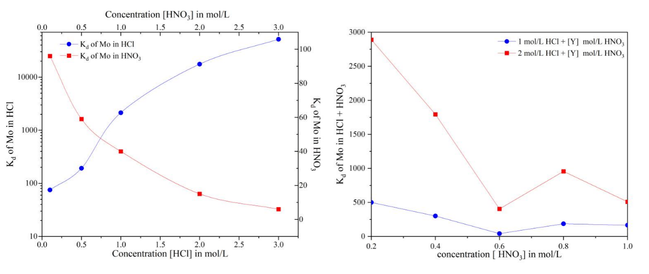 图1. 在不同HCl、HNO3和HCl-HNO3混酸浓度下Mo在TOPO萃淋树脂上的吸附