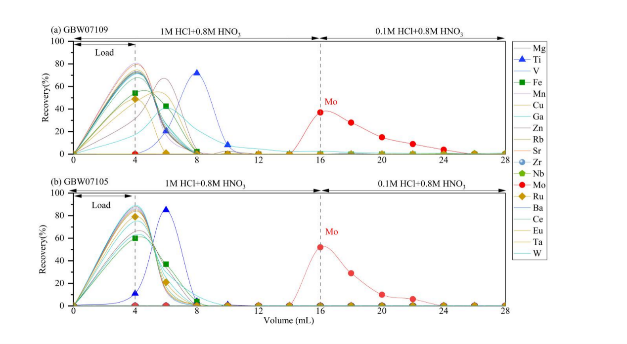 图2. TOPO树脂对地质标样GBW07109(a)和GBW07105(b)进行Mo分离的洗脱曲线,对应的钼回收率分别为97%和93%
