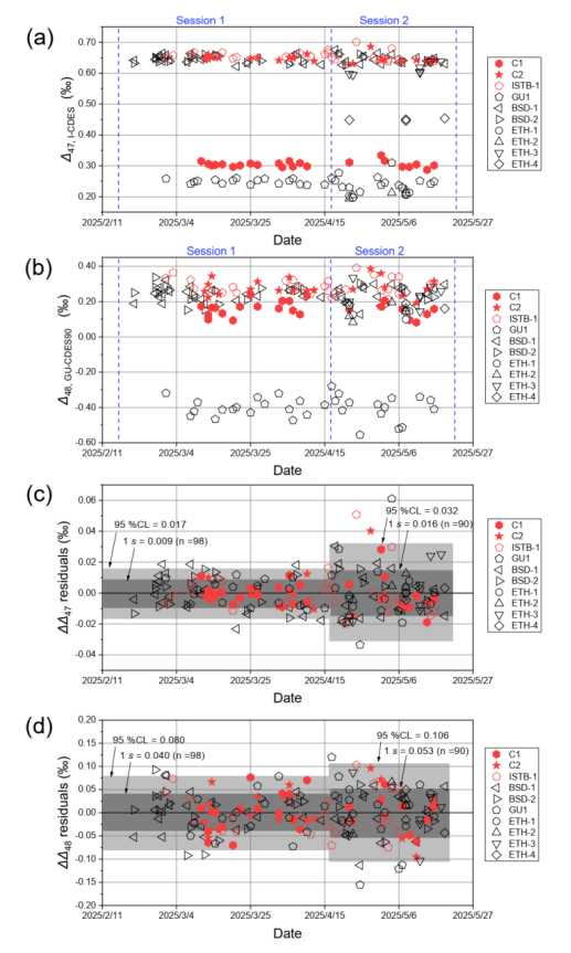 针对上述难题,中国科学院广州地球化学研究所郭炀锐副研究员和博士生郭羽翯等研究团队,自主研发了前处理系统,并与253 Plus同位素比值质谱仪联用实现在线测试,该分析系统整合了可编程逻辑控制器(PLC)与酸解装置、低温纯化及温度控制单元,实现了最少人工干预下的连续自动化分析(图1)。该系统采用简易化硬件设计,不仅成本可控,还具备高度灵活性,可根据不同研究需求进行定制化改造,适配其他同位素分析体系。研究团队通过一系列碳酸盐参考物质(包括实验室自制碳酸钡BSD-1、BSD-2及ETH-1/2/3/4、GU-1、C1、C2等国际通用标准物质)进行测试,表现出优异的数据分析重复性:Δ47值的标准偏差范围为0.003‰–0.023‰ (1 SD),Δ48值为0.029‰–0.078‰ (1 SD)。经数月稳定性验证,不同分析周期的归一化数据未出现显著漂移(图2),进一步证实了系统的可靠性能。