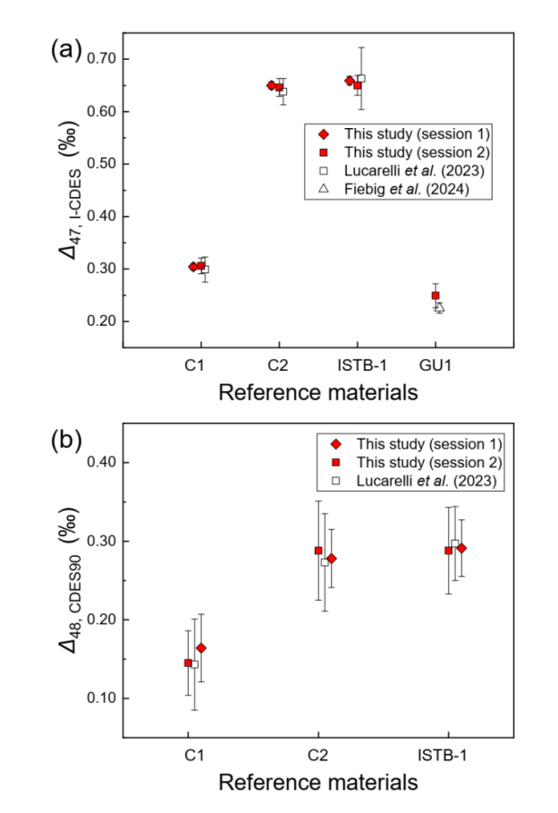 研究团队将部分国际通用标样的实测数据与已发表结果进行对比,发现基于固体碳酸盐(未使用平衡气体标准)的归一化方法有望实现不同实验室间Δ48数据的一致性(图3),为解决该领域目前存在的实验室间数据可比性难题提供了新方案。该分析系统的研发成功,不仅大幅提升了双团簇同位素分析的效率和数据可靠性,还降低了技术门槛,使更多实验室能够根据该研究提出的搭建方法开展相关研究,有望促进双团簇同位素技术在古气候重建、地质过程示踪等领域中发挥重要作用。