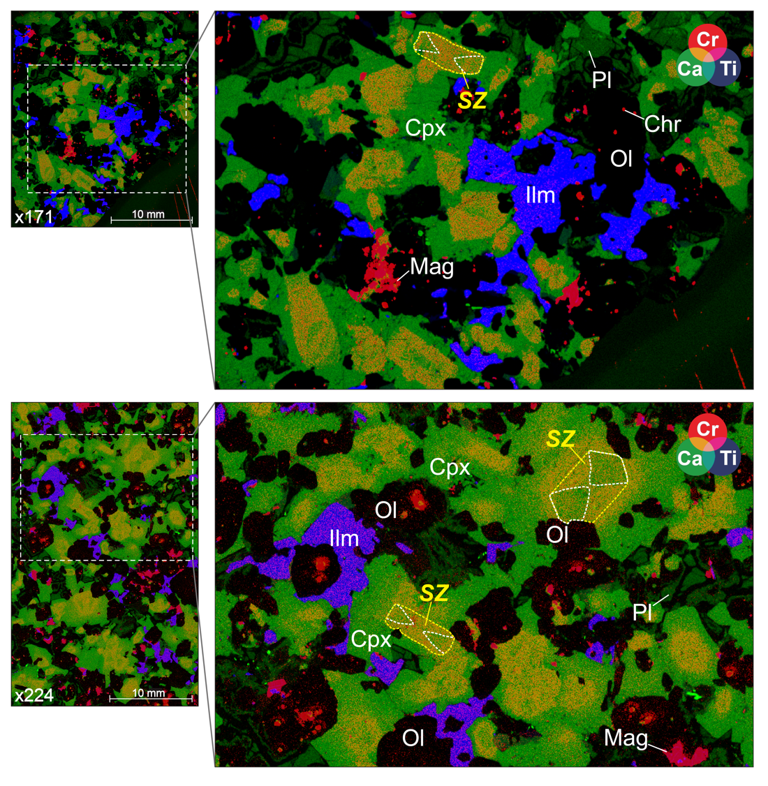 “To distinguish the textural relationships between minerals and examine potential chemical zoning in Cpx, multi-elemental mapping of large areas (ca. 3 × 4 cm) of four samples (x27, x29, x164 and x224) were conducted on well-polished thin sections using a SIGRAY AttoMap™-310 microbeam X-ray fluorescence (micro-XRF) at Guangzhou Institute of Geochemistry, Chinese Academy of Sciences. The instrument is equipped with a multitarget X-ray sources (SiC, Cr, Cu and Rh), an optics enclosure with four X-ray optics and one silicon drift X-ray detector. We applied a condition of 35 kV and 570 μA over the Cu source target for generating the primary X-ray which is optimal forexciting high-intensity Kα lines of Ca, Ti and Cr during a single scan. Elemental maps were created using the Fly Scan mode with a 12 μm spot on a 15- to 35-μm raster with dwell times of 100 ms/pixel.”